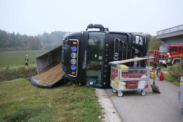 Die Unfallstelle wurde von der Freiwilligen Feuerwehr gesichert, vor allem auslaufende Betriebsstoffe mussten gebunden werden. Die Ladung, rund 20 Tonnen Futtermittel, musste abgesaugt werden.